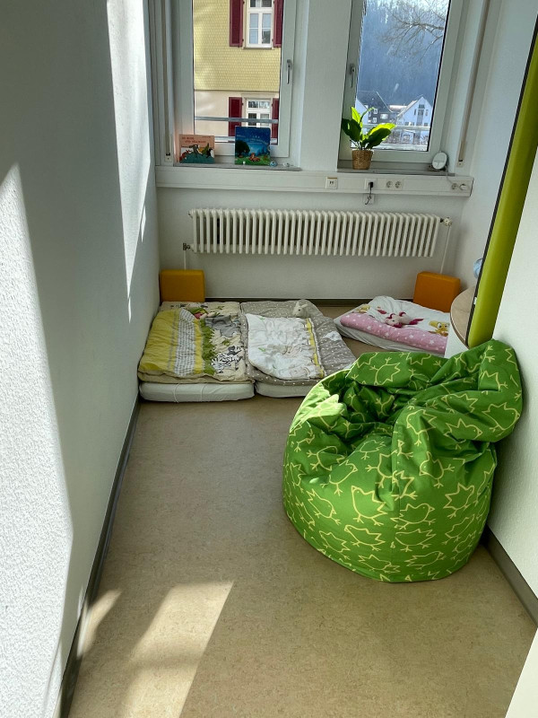 Daneben befindet sich der Kuschel- und Ruheraum. Hier können in ruhiger Atmosphäre Bücher gelesen, mit Kuscheltieren und Puppen gespielt und kann geschlafen werden.