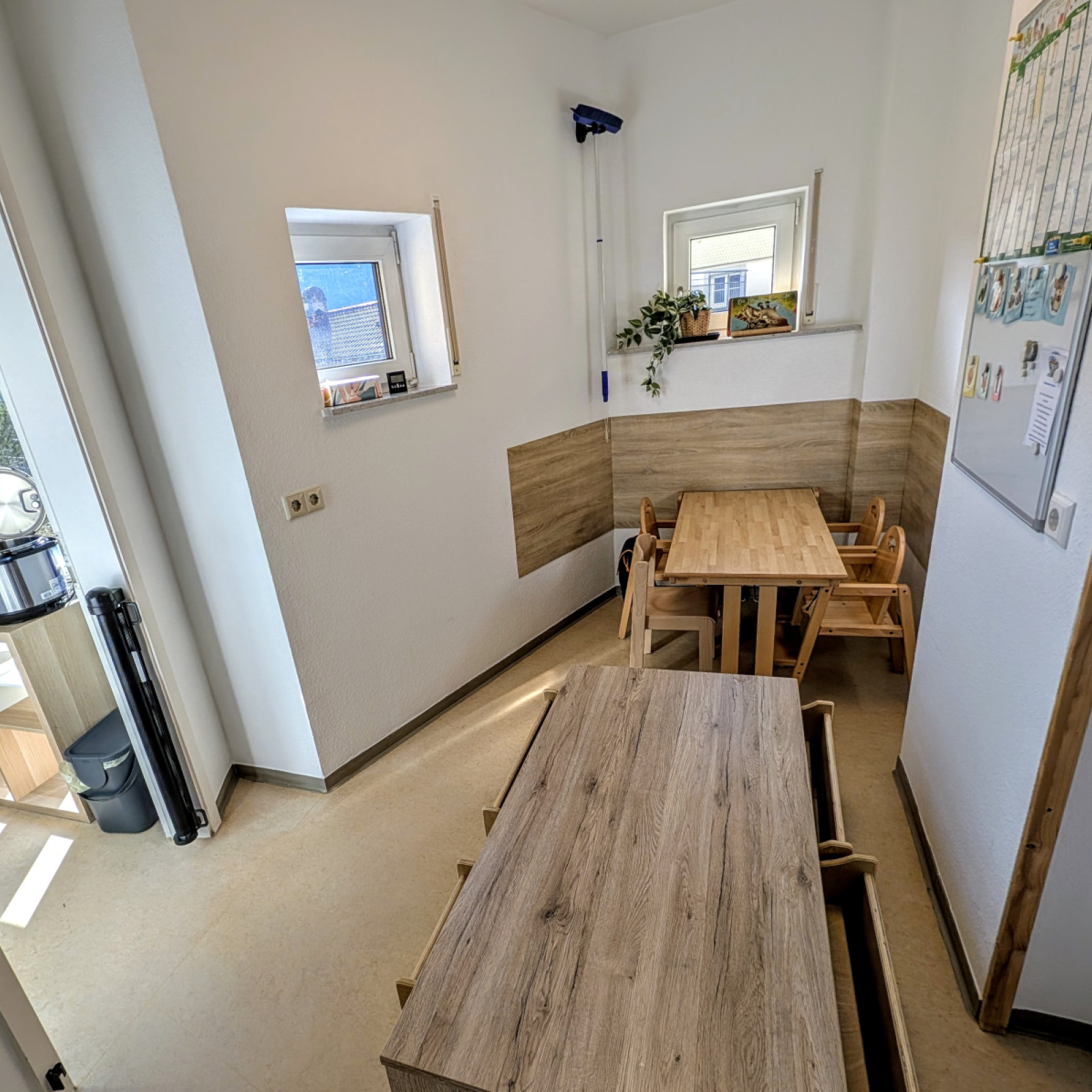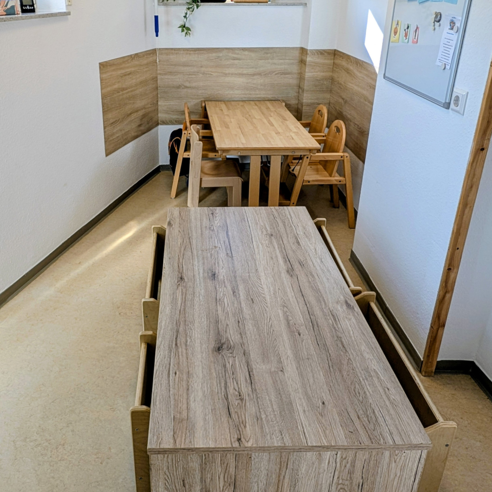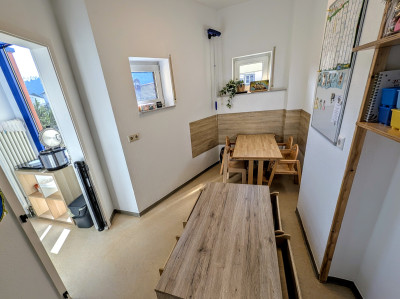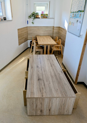 · eine Tischgruppe, welche zum Essen und für kreative Aktivitäten