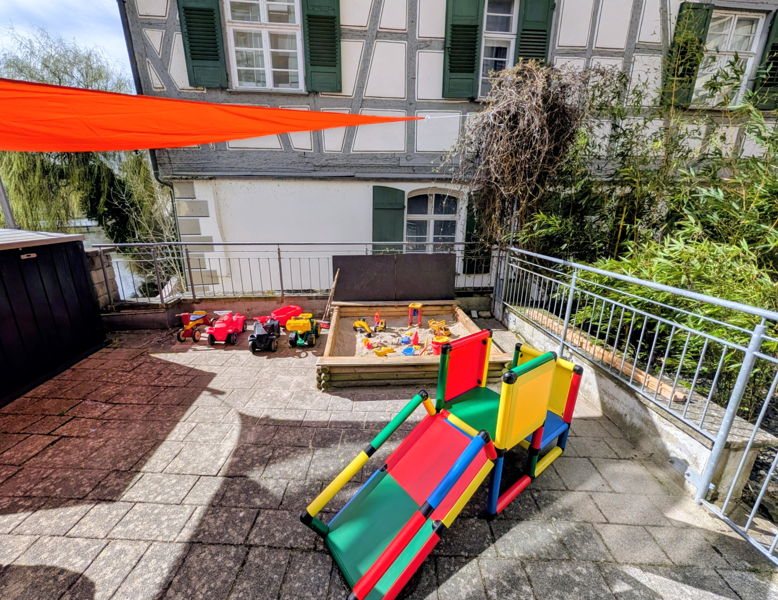 Direkt vor dem Eingang befindet sich eine eingezäunte Terrasse, welche an den auch eingezäunten Innenhof grenzt, wo Fahrzeuge gefahren werden können und die Nestschaukel genutzt werden kann.